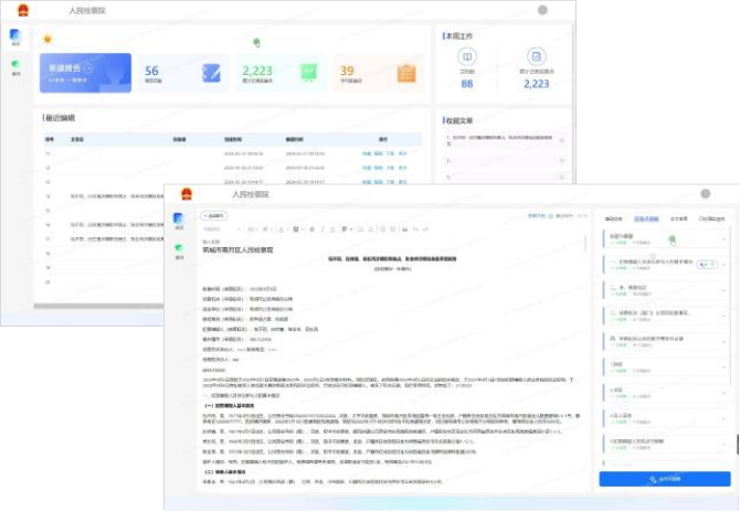 專為檢察紙關打造的智能化審查系統,基于 司法領域大模型深度適配案件起訴文書審查規(guī)范,提供智能文書校驗、證研鏈分 析、合規(guī)性審查等功能,有效提升辦案質效與司法規(guī)范性。